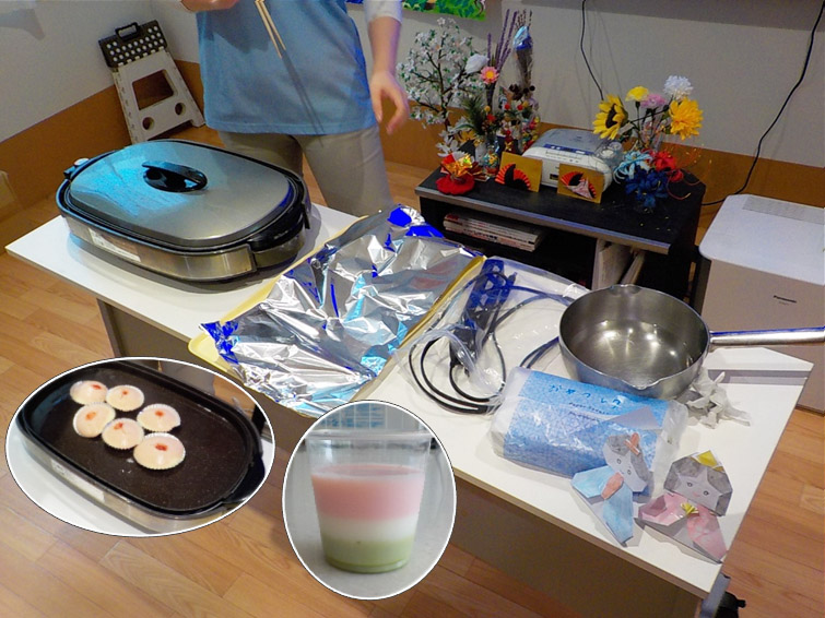 桜色の蒸しパンと三色プリンを提供いたしました。